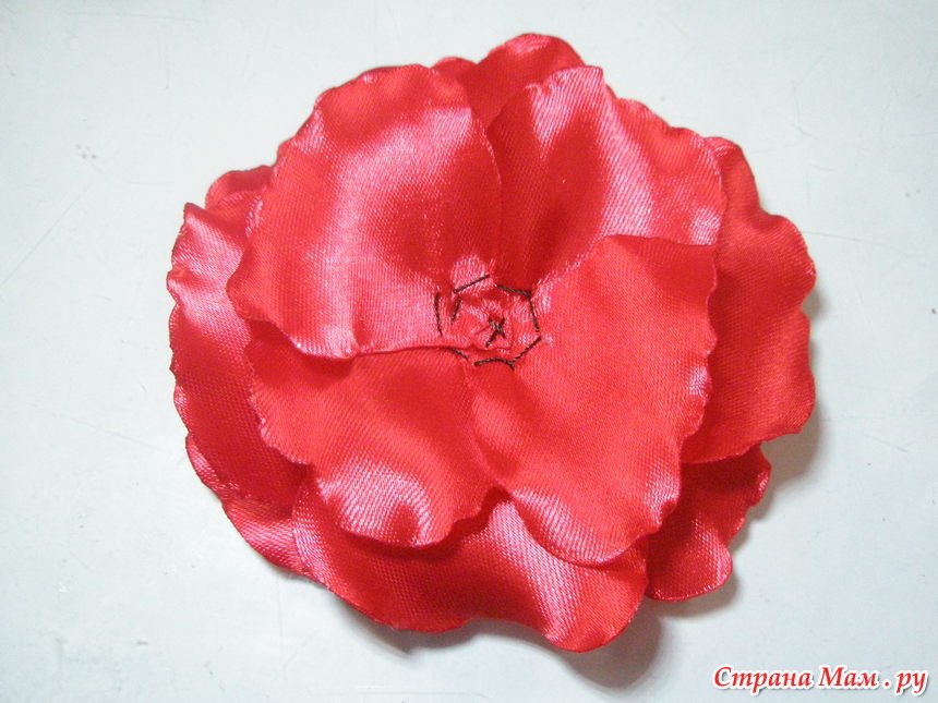 - Делаем по 16 лепестков из красной и зеленый ленты. А также 16 лепестков из золотой парчи длиной 16 см, как на фото.