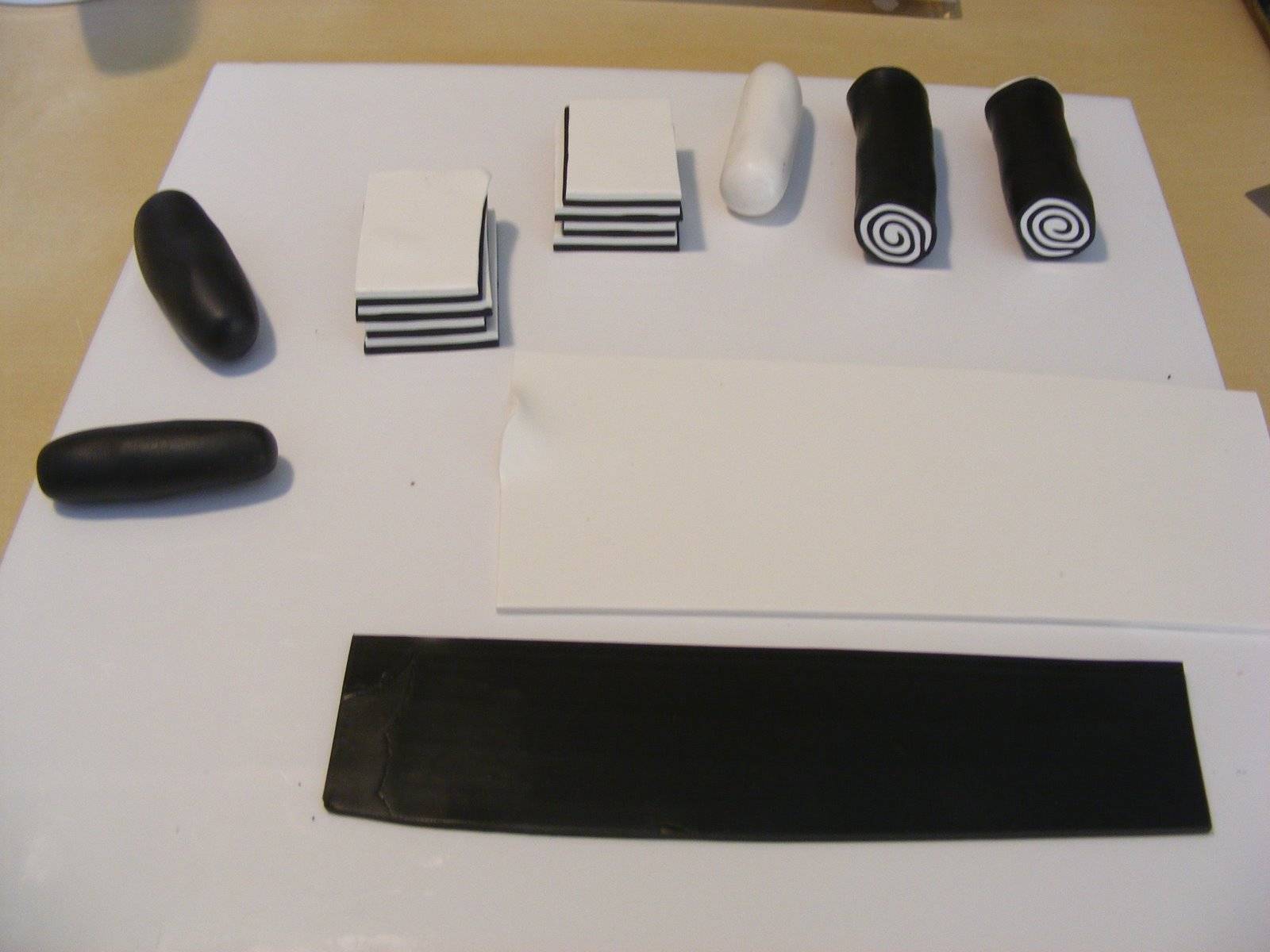 Предлагаем сделать простой кейн для элегантных украшений в черно-белой палитре.Для работы понадобятся брусочки материала чистого черного и белого цвета, канцелярский нож или острая пластина для резки, скалка или стеклянная бутылка для раскатки «теста», пресс для выдавливания. Опытные рукодельницы рекомендуют работать в медицинских перчатках. Это позволит работать аккуратно, не оставляя отпечатков пальцев на нежной фактуре глины.