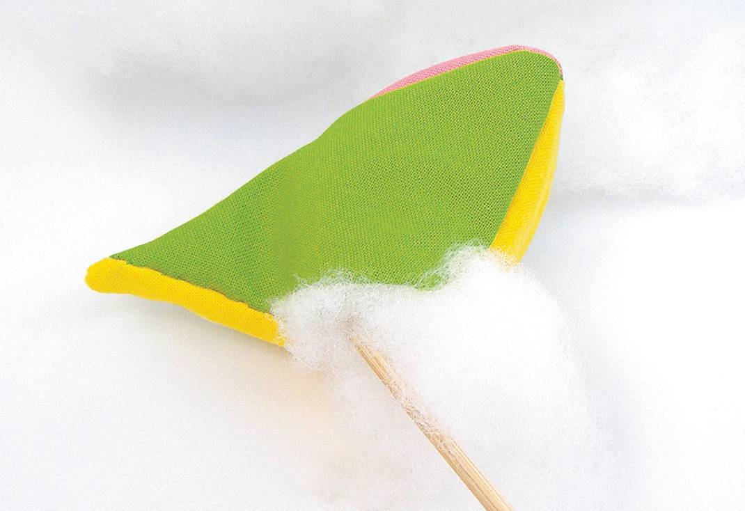 - Открыть самый первый загиб так, чтобы увидеть изнанку ткани и уложить туда немного синтепона, предварительно скатав материал в сферу. Подложить элемент максимально близко к клюву – это голова.