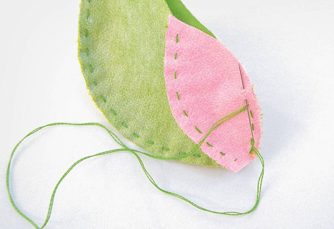 Теперь сшиваем обе детали вместе иголкой с ниткой, заполнив синтепухом, и украшаем бисером.