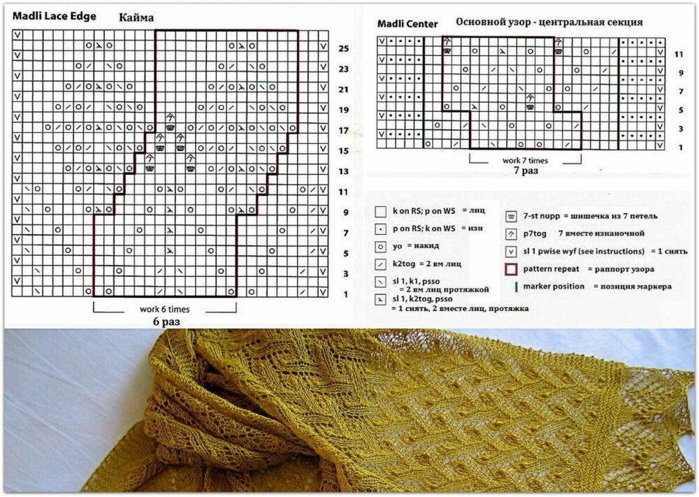 Представляем вашему вниманию еще несколько картинок со схемами и узорами, которые подходят для вязания ажурных шарфов, палантинов или накидок, причем один и тот же узор при использовании пряжи разных цветов смотрится абсолютно по-разному. Поэтому прежде чем начинать вязания всего изделия рекомендуем вам выполнить небольшой образец, увлажнить его и просушить, чтобы понять, как ведет себя та или иная пряжа после стирки.