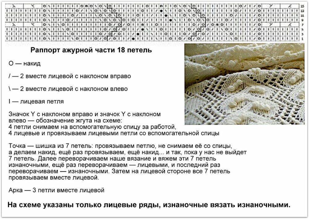 - На схеме палантина приведено вязание шишечек. Их нужно вывязывать следующим образом: в одном ряду из 1 лицевой петли, из той, из которой по рисунку должна идти шишечка вывязать поочередно 1 лицевую и накид 5 раз. В следующем ряду эти вывязанные петли и накиды провязать 1 петлей.