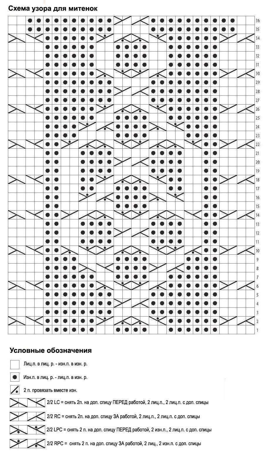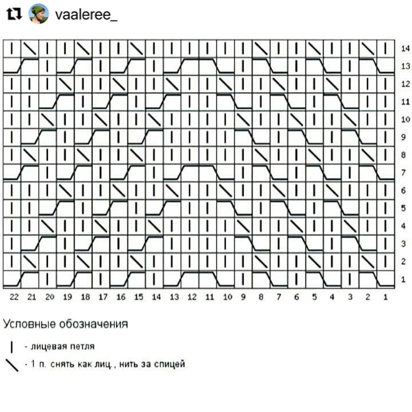 - 9-13 Р: вязать ряды по узору: над лицевыми – ЛП, над изнаночными петлями – ИП.