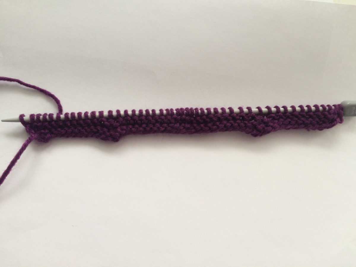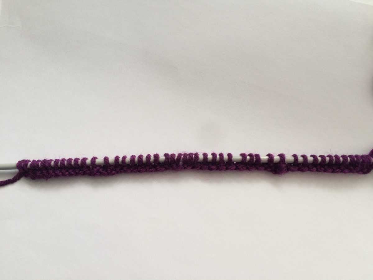 - Вторую сточку обязательно начинаем с изнаночных петель. Их должно быть также 12. Затем две лицевых петли с наклоном влево, 10 лицевых, один накид и одна лицевая петля.
