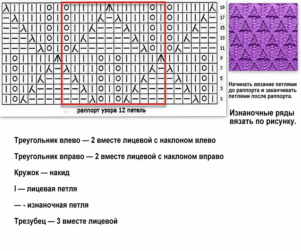 - Продолжаем вывязывать узор «ромбы» спицами. Схемы и описание несложные. Учтите, что один раппорт в высоту составляет 12 рядков.