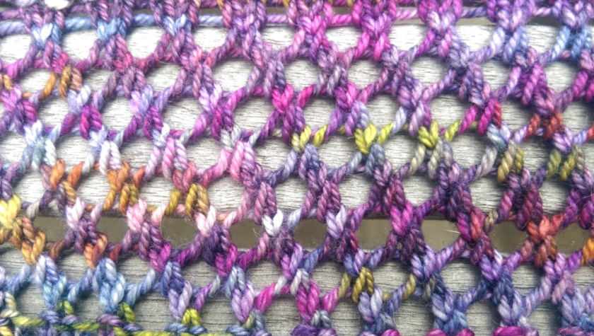 Третий ряд повторяет узор первого, а затем идет четвертый – он вяжется так же, как второй. В итоге мы получаем красивый сетчатый узор из лицевых петель, поскольку основа узора – это первый ряд с накидами.