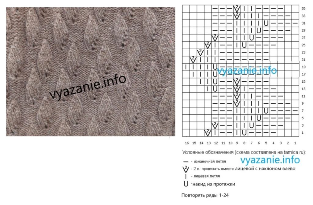 Для вязания полотна с кромками этим узором необходимо набирать на спицы количество петель кратное 9, плюс две кромочные петли. Раппорт узора составляет 24 ряда и 9 петель в одном ряду. На схеме приведены только лицевые ряды, в изнаночных рядах петли вязать по рисунку, накиды – изнаночными петлями.