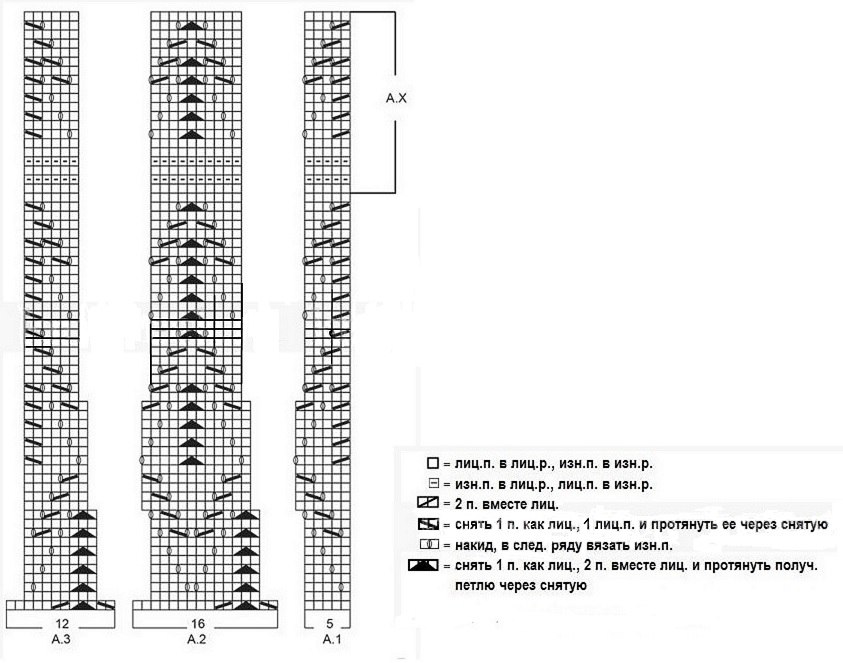 - распределите п. далее так: 5 п. платочной вязкой, *2изн., затем по схеме А1* – посторите от * до * 2 р., в конце 2изнан., 5 п. платочн. вяз.
