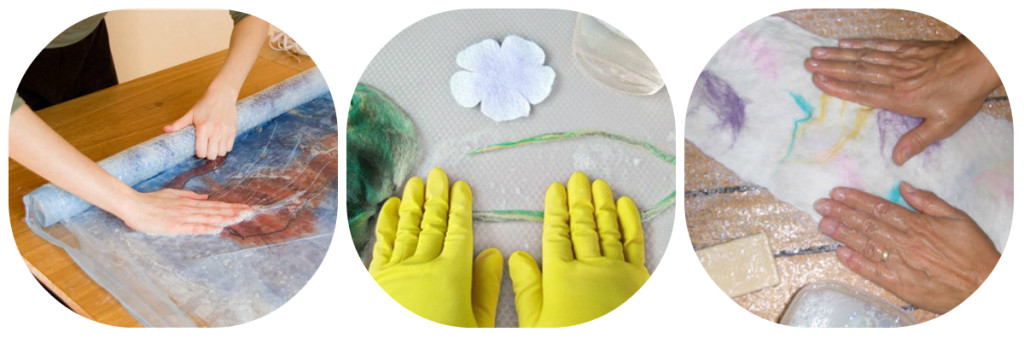 Если быть точнее, то мыльный раствор, которым обильно смачивают разложенную шерсть, после чего трут, катают, кидают и всячески «издеваются» над шерстью, пока она не превращается в ровное красивое полотно.
