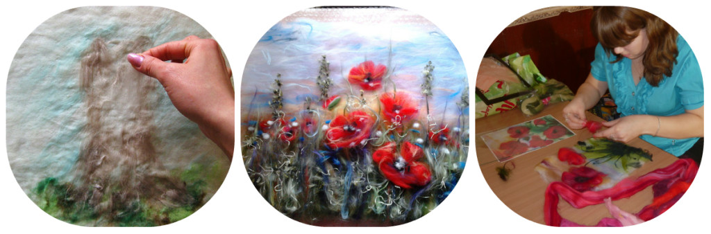 Есть более сложный способ валяния картин – именно валяния, изначальное полотно с основными контурами и цветовыми пятнами валяется мокрым способом, а детали набиваются иглой после просушки.
