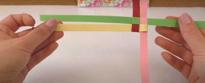 Начинаем переплетение. Переплетаем все полосочки в шахматном порядке. Действуем аккуратно, стараясь не допускать промежутков. Подравниваем края. Приклеиваем петельку. Для этого отрезаем, по желанию тонкую красную, либо белую полоску. Приклеиваем ее между двумя половинками. Любуемся результатом своего труда.