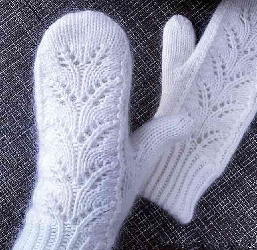 А вот пример чисто-белых варежек. Изящный цветочный узор, связанный так, что он становится выпуклым, придаёт этому аксессуару особенно чарующий вид. Красиво и женственно.