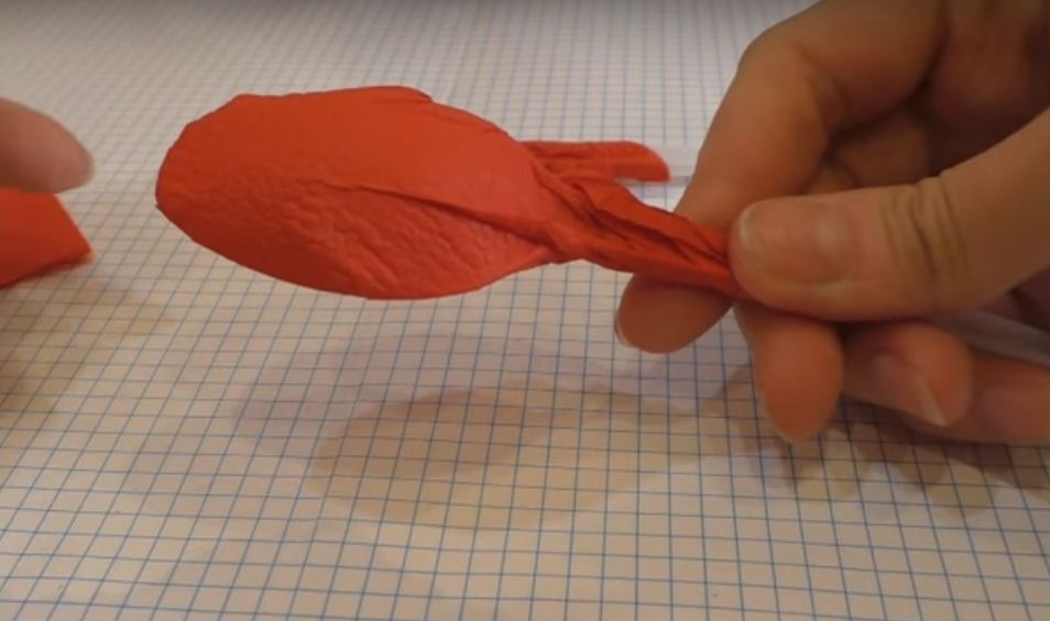 Вырезаем из бумаги заготовки лепестков цветка. На один бутон понадобится 4 лепестка. Наносим клей на первую заготовку, и приклеиваем по краям еще два лепестка. Внутрь вклеиваем стебель – синельную проволоку зеленого цвета. И заклеиваем оставшееся пространство последним лепестком.