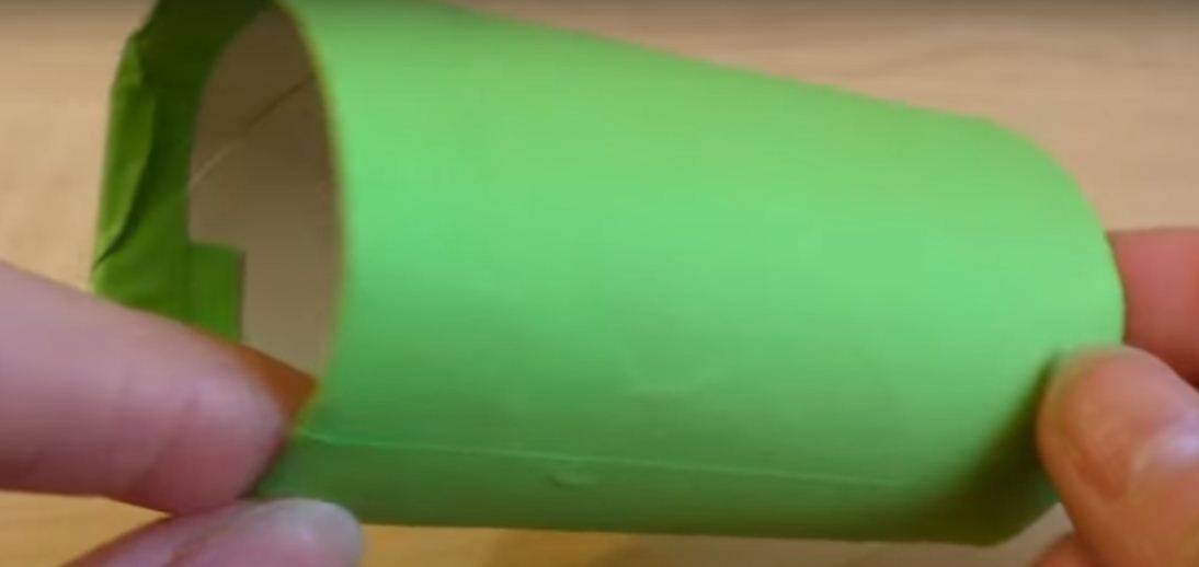 Промазываем зеленую бумагу клеем. Улаживаем на нее втулку и заворачиваем. Теперь загибаем бумагу с двух сторон, внутрь втулки.