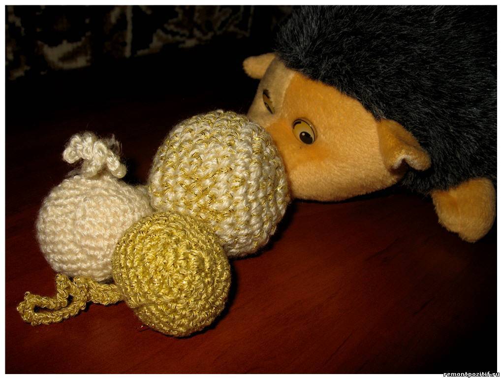 Такие шарики можно условно разделить на два вида: одни полые внутри, представляют собой вязанную оболочку, накрахмаленную, чтобы держать свою форму; другие вяжутся плотно и набиваются наполнителем, например, синтепоном.