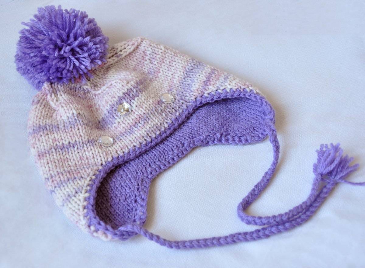 Поменяйте цвет пряжи на розовый или сиреневый и вяжите шапку для новорожденных девочек. В описании рассказано о том, как вязать для деток от 3 месяцев, но вы внимательно прочитайте статью, в которой я объясняю, как изготовить головной убор для только что родившегося младенца от 0 месяцев. Узоры использованы простые: — лицевая гладь; — платочная вязка.