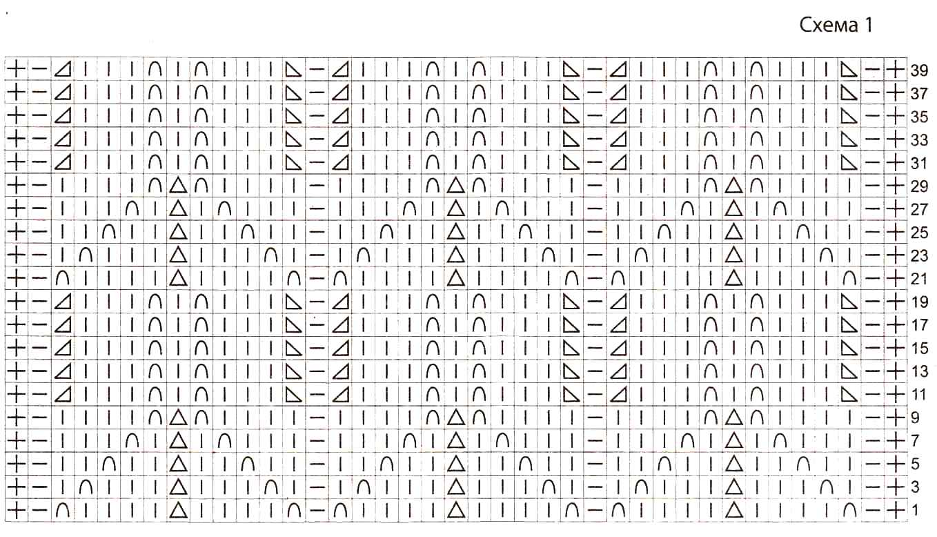 Схема дана для обхвата груди 96,5 см, длина 54 см. Узор вяжется по схеме:
