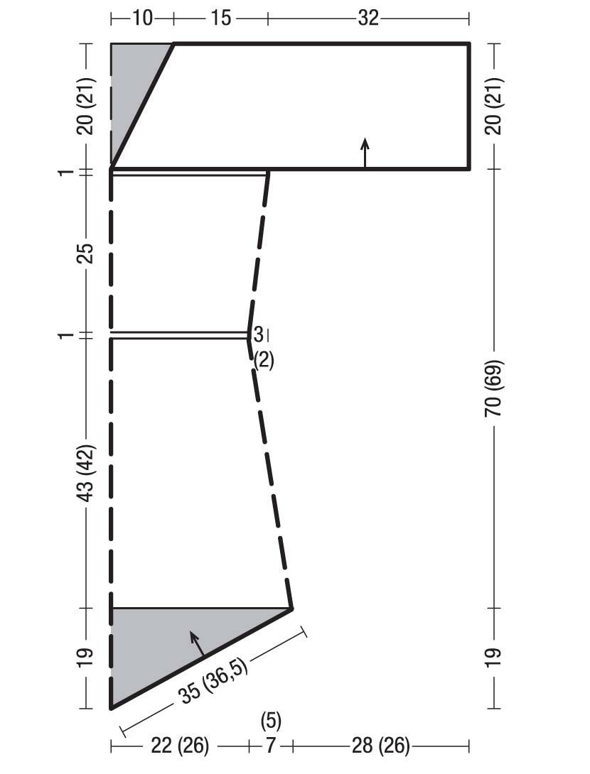 Выкройка дана на размеры 36/38 (42/44) 48/50. Расход ниток – 450 (500) 550 грамм шерсти пополам с акрилом, спицы №6 и 7.