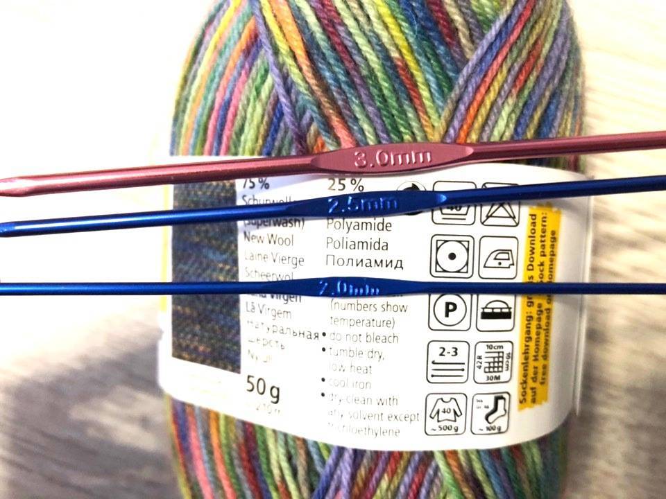 Например, на этикетке на фото написано, что можно использовать спицы или крючок 2-3 мм. Это значит, что вы можете взять крючок № 2, № 2,5 или № 3.