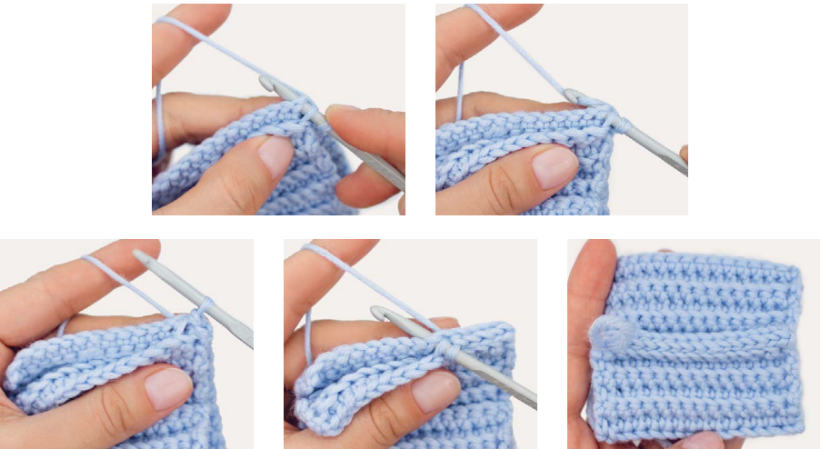 - Повторите шаги с 4 по 6 еще разок и затем по аналогии приступайте к вязанию лицевых рельефных столбиков, при этом крючок вводится спереди изделия.