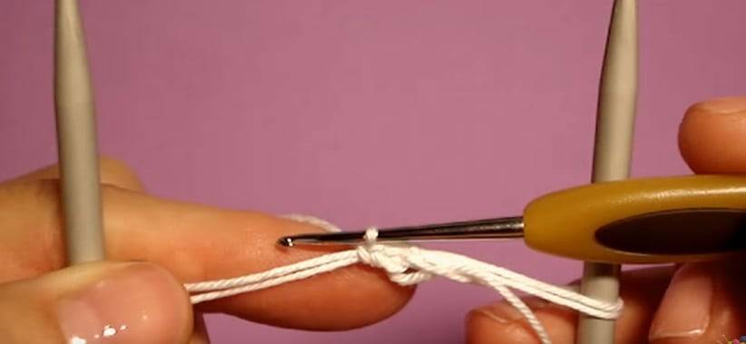 3. Дальше следует перенести крючок к задней части вязального инструмента, повернуть изделие и под длинным витком, которая получилась слева, провязать две петли без накида.