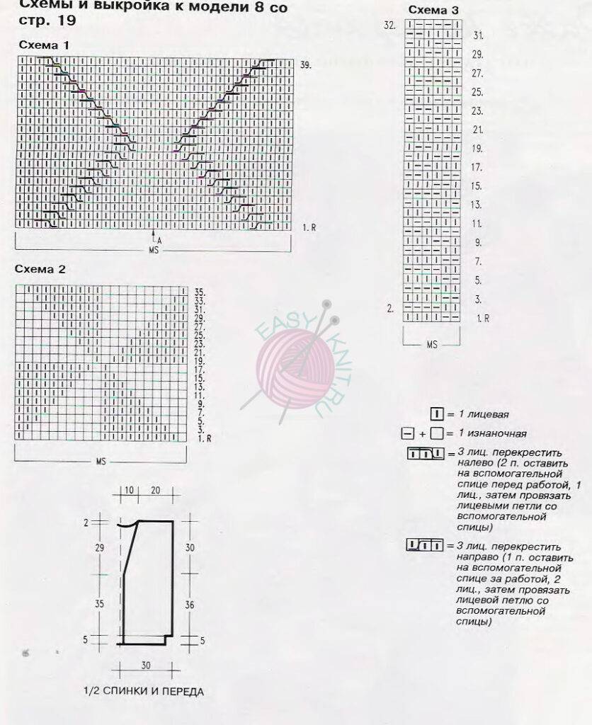 - полоса ажура: выполняется по схеме. На сх. показаны только л/р. В и/р все п. и н. вяжем и/п, два н., расположенных подряд вывязываем – 1-ый н. – л/п, 2-ой н. – и/п. Повторяем с 1-го по 6-ой р.;