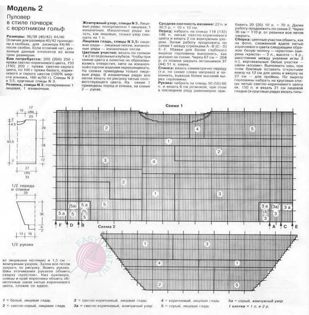 Пряжей голубого цвета поднимаем на круг. сп. по верху бокового края переда на 22,5; 24,5; 26,5см 34; 37; 40 пет., затем через шов на плече песочной пряжей поднимаем по верху бокового края спинки на22,5см; 24,5см; 26,5см 36; 39; 43 пет. На этих 70; 76; 83 пет. провязываем 1 изн/р: 1 кром., 35; 38; 42 л/п песочной пряжей, 7; 8; 9 л/п, 10 и/п, 16; 18; 20 л/п, 1 кром голубой пряжей. Этот р. для дальнейших расчетов не учитываем.