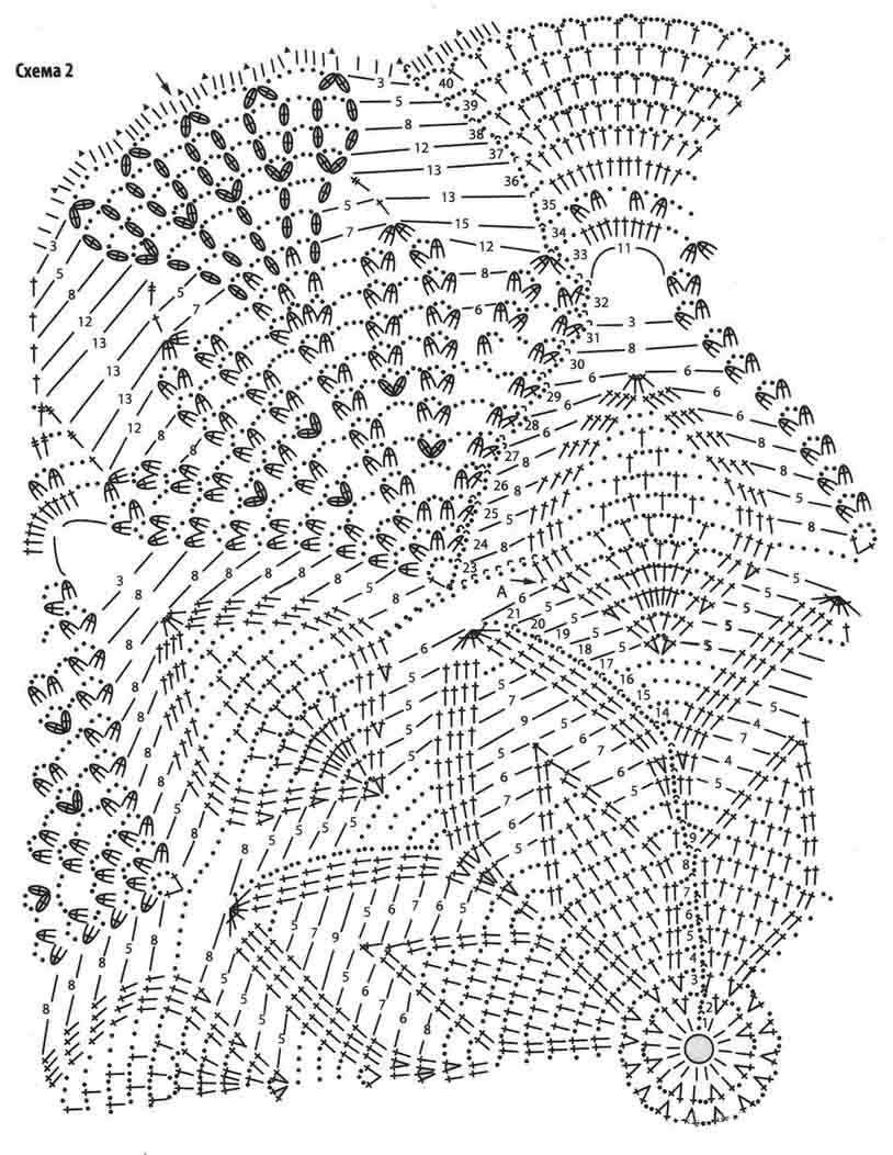 Со схемами я не разбиралась, но нашла видео по вязанию подобного. Правда, там показан только один ярус, но посмотрев, станет понятно, как вязать второй, принцип тот же.