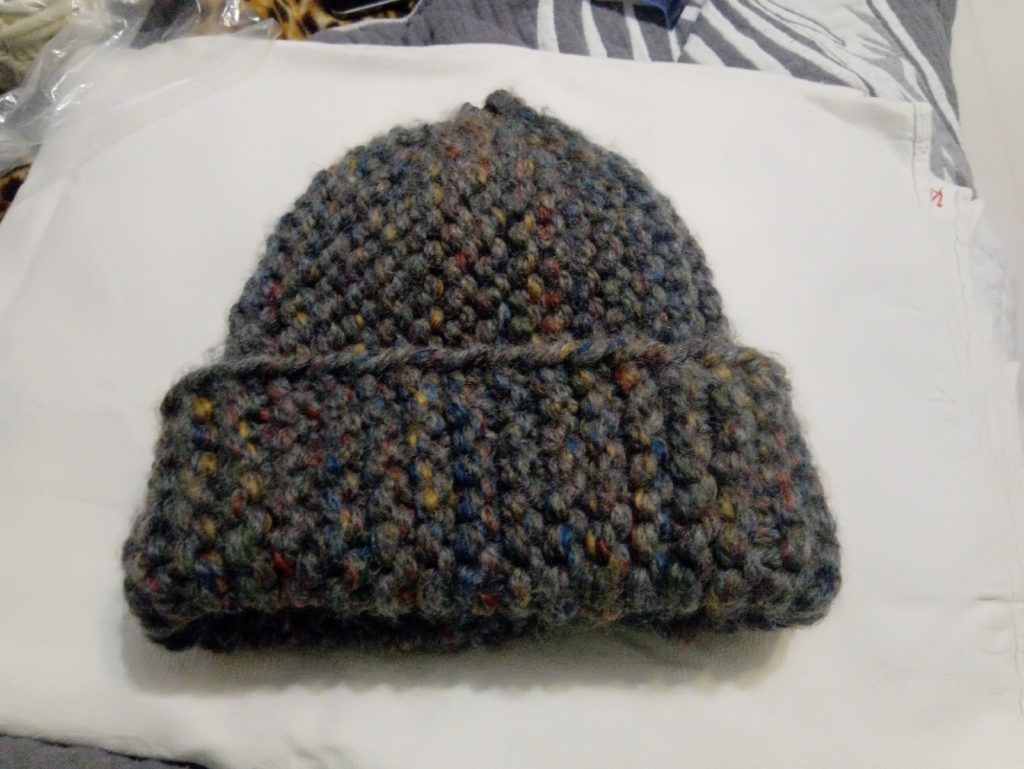 Еще одна особенность модели в том, что она состоит из нескольких клиньев. Их можно вязать каждый по отдельности, а потом сшивать. Я предпочла второй вариант — шапку вязала из толстой пряжи слитно, единым полотном. Вот так она выглядела, когда ее сшивали последним этапом.