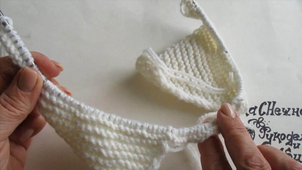 Провязав нужную длину ушка, не откладывайте его сразу на спице, а довяжите половинную часть затылочной зоны: на втором фото ниже хорошо видно, как это делается: