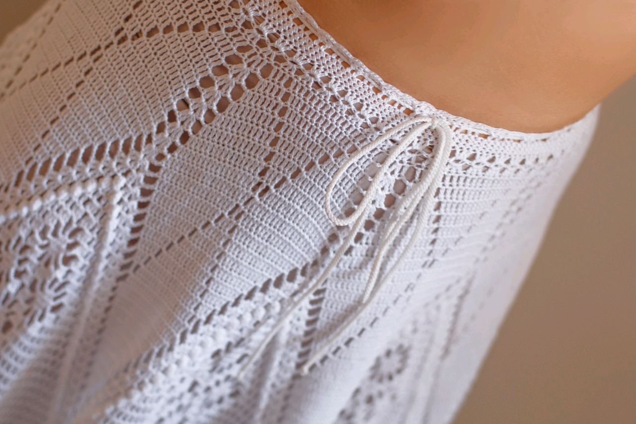 - Для завязочки при помощи крючка свяжите двойной ниточкой цепочку, используя воздушные П длиной 130 см. Отступите 2 см от верха изделия, протяните поясок от центра, проведите над 2 ИП и под 2 ЛП.