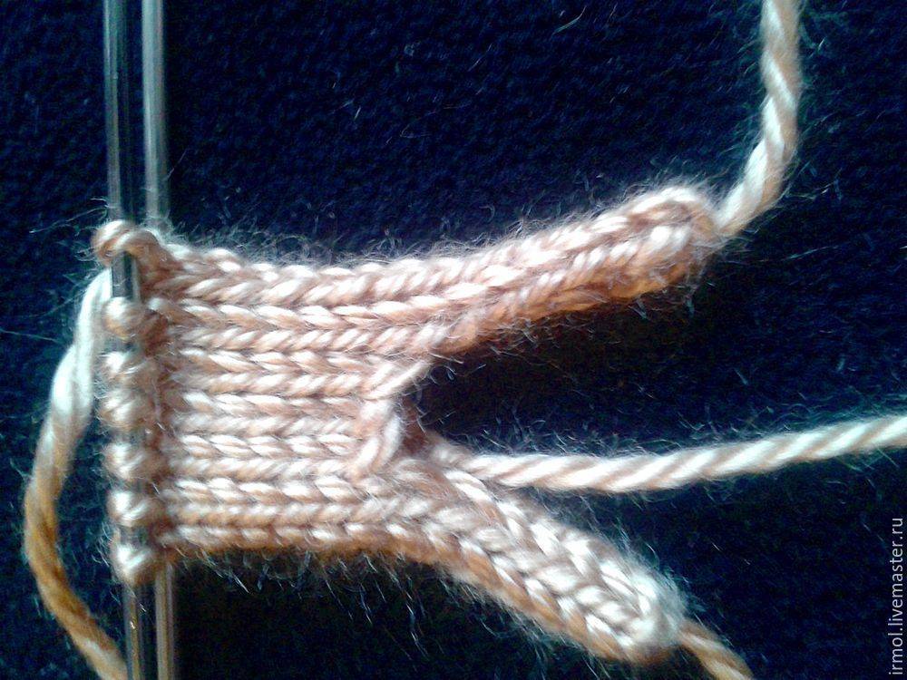 - В следующих рядах, через один, будем делать прибавление петель. Всего необходимо добавить по 6 петель с каждой стороны изн. п. Добавленные петельки вяжем платочной вязкой (платочн. в.) за заднюю стенку.