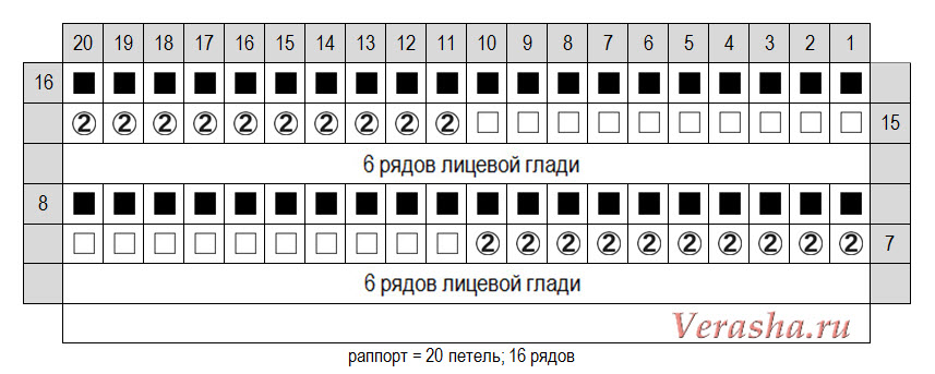 Рапорт узора здесь составляет 14 петель и 20 рядов. Все нечетные ряды связаны лицевыми, а четные изнаночными. Начало вязания — 8 рядов лицевой глади.