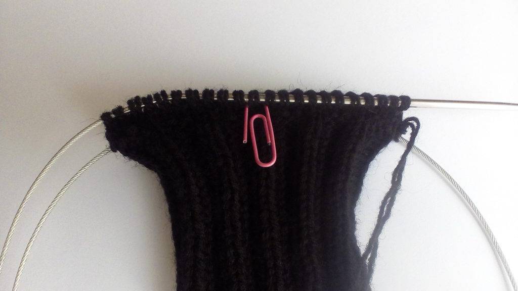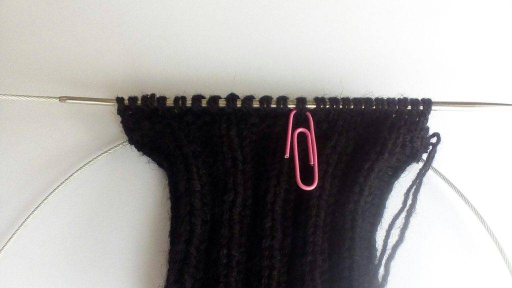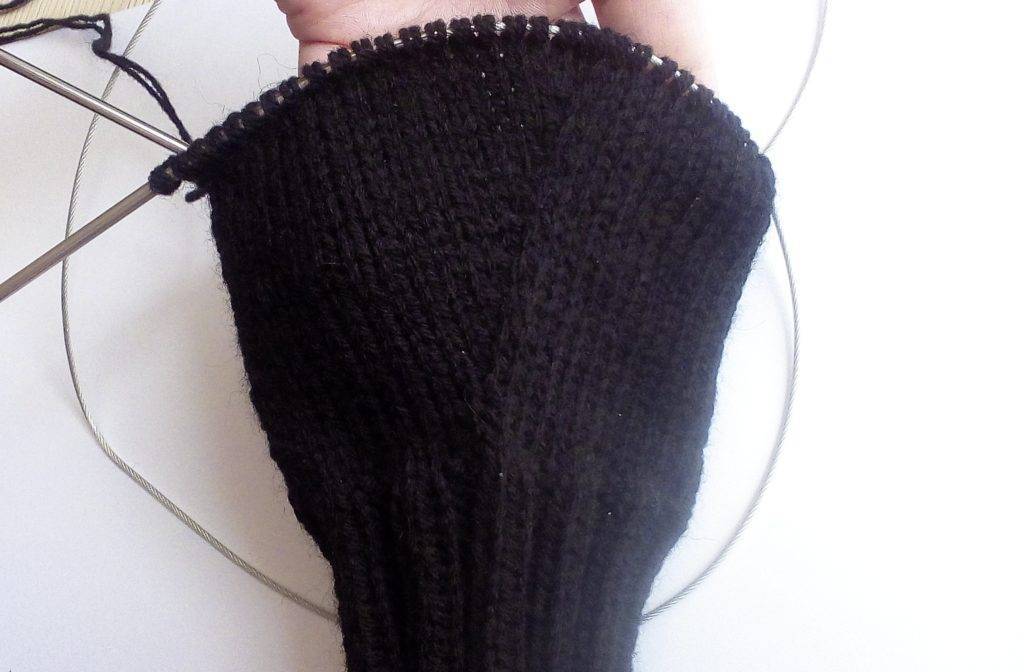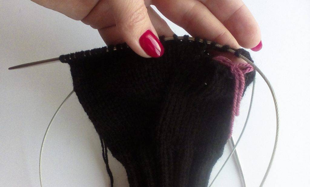 - Затем вяжите по кругу лицевыми петлями до начала большого пальца — 7 см.