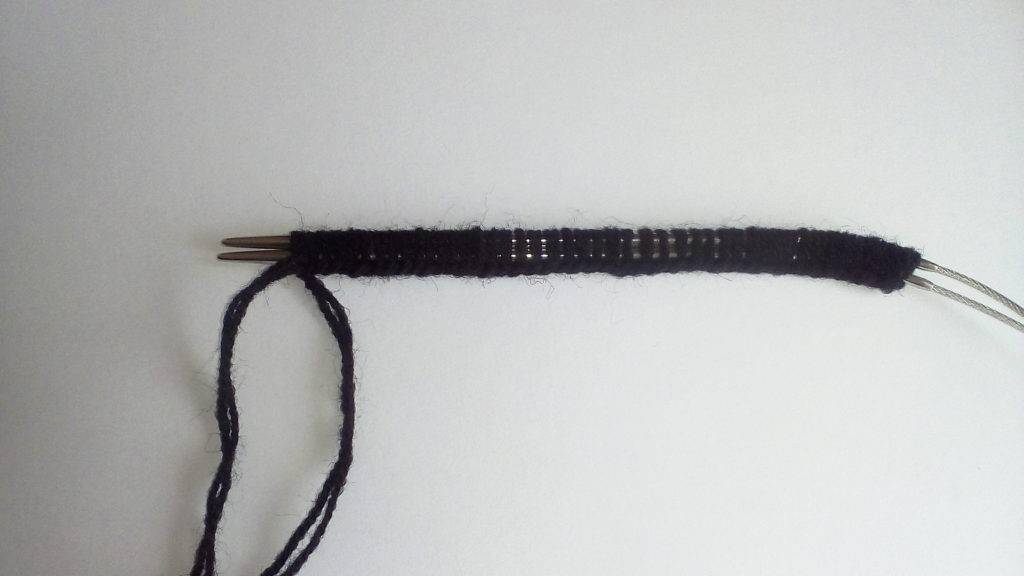 - Вяжем вторую часть пальца в обратном направлении: добавляем по петле с каждого края ряда, до тех пор, пока на спице не образуется 7 петелек.
