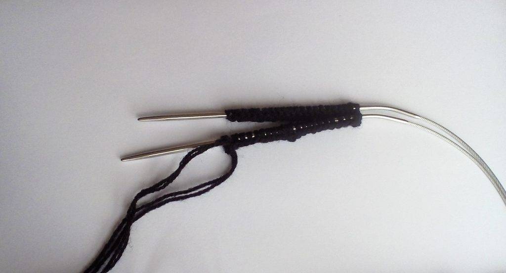 После набора петли нужно перенести на одну спицу и разделить пополам. Таким образом, получаем по 22 штуки на обеих спицах.