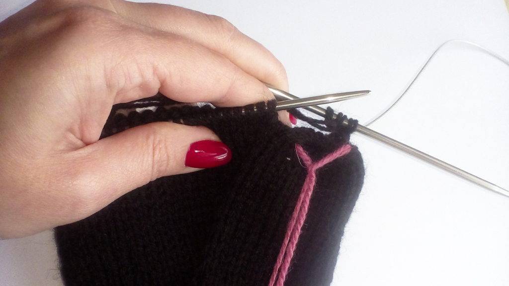Для правой рукавицы петли отсчитываем справа налево. Прибавки делаем из предыдущего ряда после 12 петли, обозначенной на фото маркером.