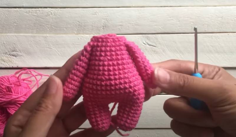 вязание наибольшей части зайца аналогично порядку работы над головой, но середина заготовки должна получиться более вытянутой, поэтому средний отрезок, в котором не убавляются и не прибавляются петли, продолжается с 10-го до 18 числа.