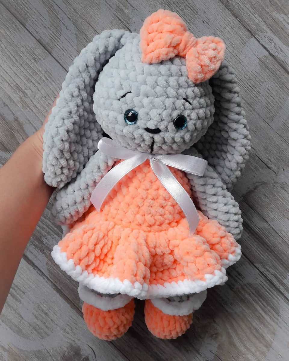 Конечно, можно сделать обычную игрушку, внешний вид которой будет приближен к натуральному. Но интереснее будет смотреться зайка тильда крючком с использованием декоративных элементов.