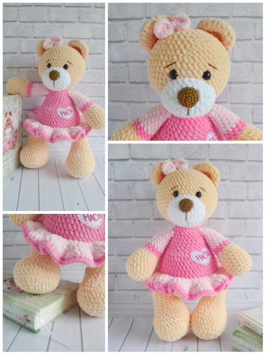 Самый сложный момент – это переход от ножек к туловищу, но тебе просто нужно обвязать две детали рабочей нитью и вести ее дальше. Очень плотно набивай ножки и формируй их вручную – это касается любых изгибов вязаных игрушек. В конце можешь спрятать за широким бантом места соединения туловища, головы и ручек медведя.