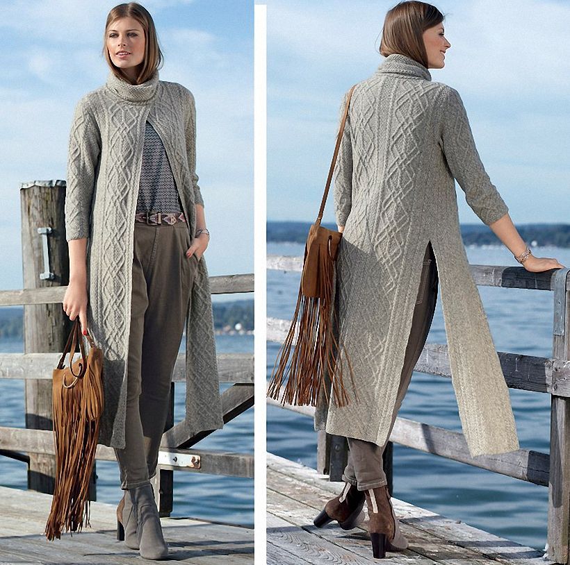 Эффектное изделие может позволить себе любая модница, умеющая вязать. Но некоторые стильные вещи не каждый мастер возьмется повторить, даже если есть подходящая пряжа, описание модели, мерки и выкройка. Однако в этом нет ничего сложного – вяжется как кофта удлиненного фасона, отдельные детали потом сшиваются.