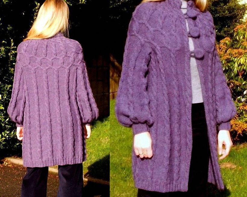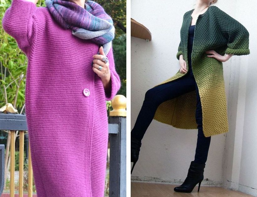 Даже если они и получатся таковыми, вы вполне спокойно сможете убрать лишнюю длину небольшим отворотом. Да, и, если вы будете вязать такое пальто из хлопчатобумажной пряжи, тогда обязательно перед тем как приступить к работе простирайте ее в теплой воде. Так вы сможете избежать усадки изделия после того, как оно уже будет готово.