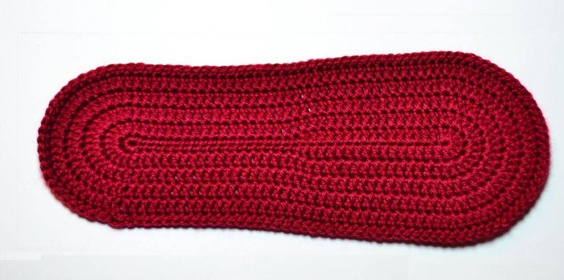 - Провяжите ряды. Их будет достаточно, когда при наложении заготовки на тапок, нитей получится как раз на весь носок, даже чуть-чуть пониже.