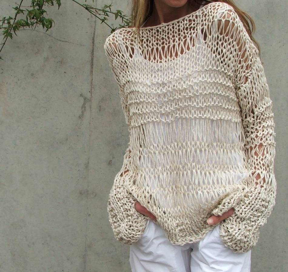 - Вязаные кофты крючком, спицами в стиле «оверсайз» (т.е. «на размер больше»). Такая кофта может быть одета на джинсы или лосины, с юбкой или шароварами.