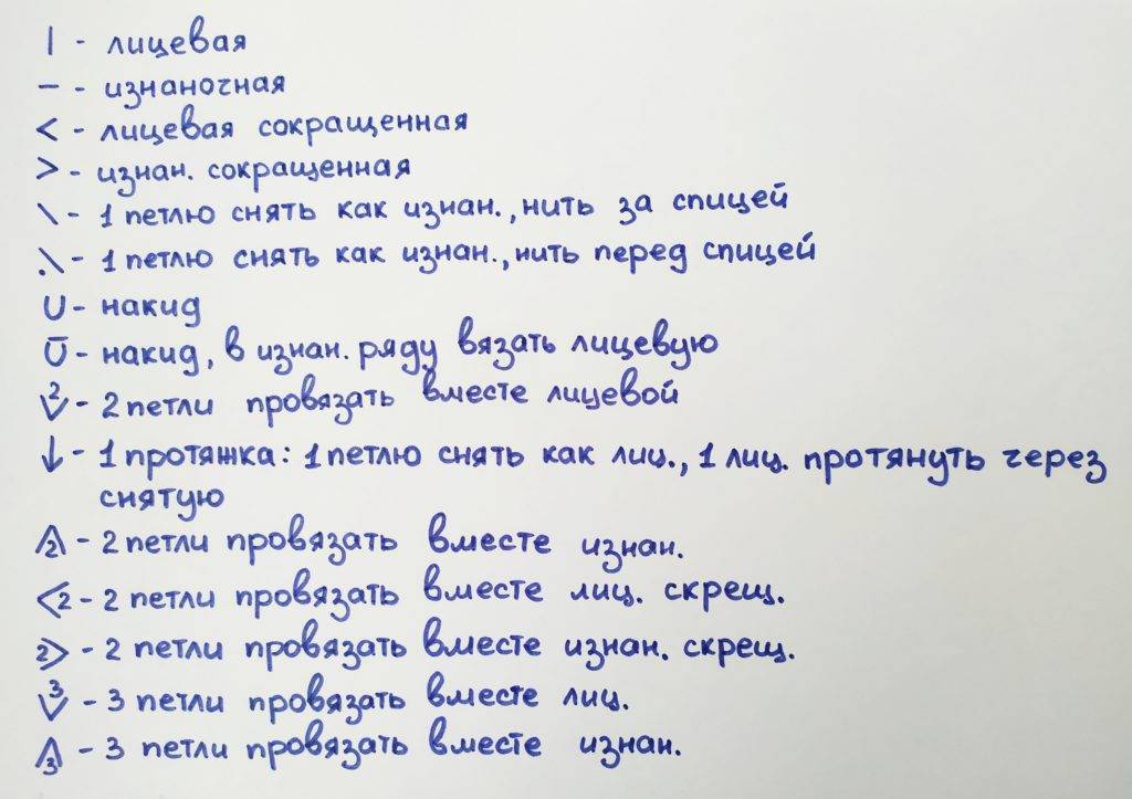 Буква Т с наклоном вправо показывает две лицевые, провязанные вместе за переднюю стенку. Буква Т с наклоном влево — две лицевые вместе за заднюю стенку.