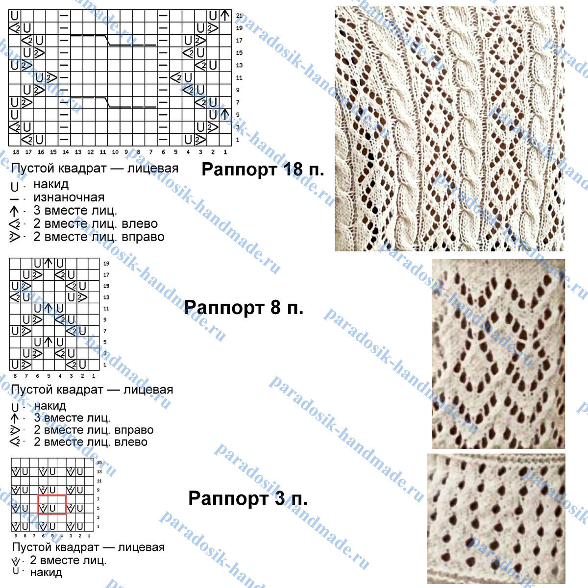 - Основной ажурный узор кардигана, который идёт на спинке и переде — ажурные ромбы, между которыми объёмные жгуты (перекрещивание влево: 4 петли снять на вспомогательную спицу перед работой, далее провязать 3 лицевые, затем лицевыми снятые 4 петли). Раппорт узора 18 петель и 22 ряда в высоту. На схеме указаны только лицевые (нечётные) ряды, изнаночные (чётные) вязать по рисунку.