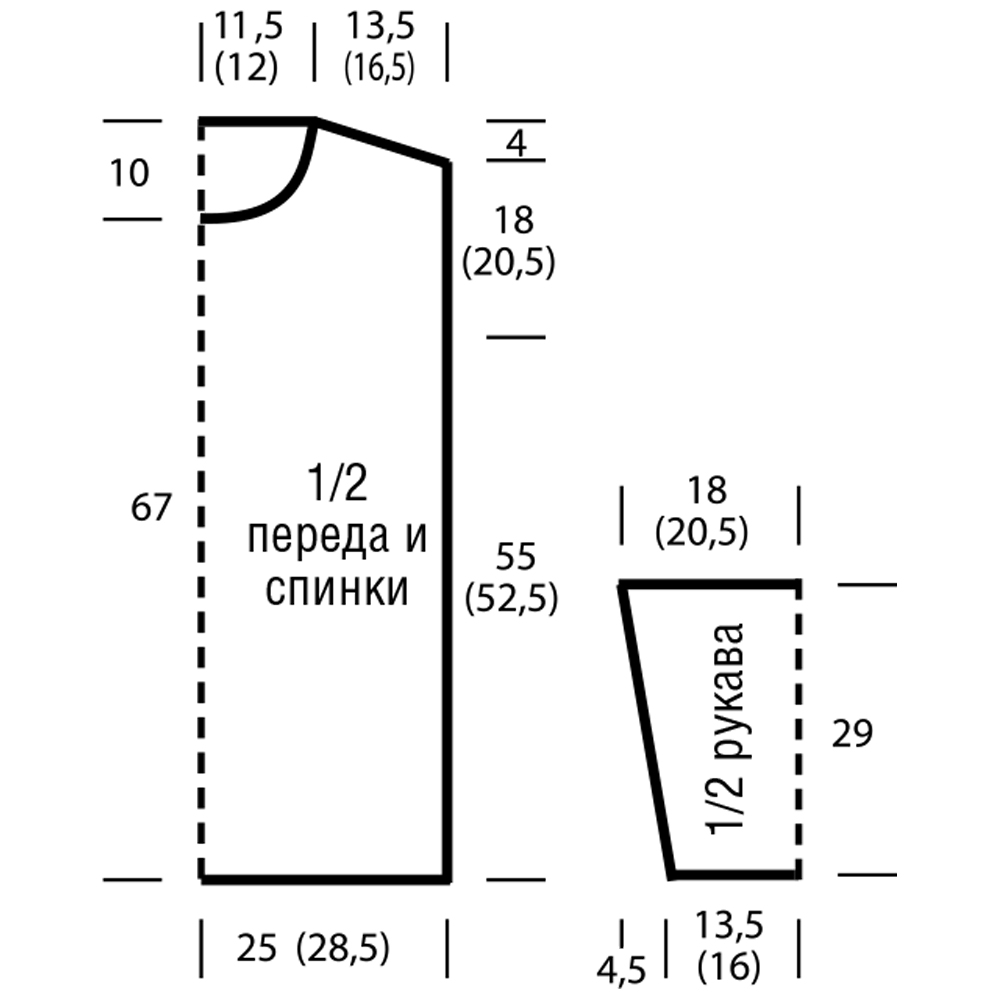 Для уменьшения ширины через 37 см = 104 ряда от начального ряда убавить 1 х 4 (5) п. следующим образом: в 1-м рубчике узора 2 сразу после кромочной, затем в каждом 2-м рубчике узора 2 внутри узора 1 провязать по 2 петли вместе изнаночной = 104 (118) п. Через 51.5 см = 144 ряда от начального ряда продолжить работу согл. последовательности полос В и одновременно в 1-м ряду убавить еще 1 х 4 п. Для этого в пропущенных 4 рубчиках узора 2 внутри узора 1 провязать по 2 петли вместе изнаночной = 100 (114) п. Между полосами узора теперь располагаются по 2 п. узора 2, после и перед кромочной — по 1 п. узора 2. В результате число петель узора 1 кратно 14 + 2 кромочные. Через 67 см = 188 рядов (64.5 см = 180 рядов) от начального ряда закрыть для пройм с обеих сторон 1 х 4 п., затем в каждом 2-м ряду закрыть 1 х 3 п., 2 х 2 п. и 2 х 1 п. = 74 (88) п. Через 86.5 см = 242 ряда от начального ряда закрыть все петли, при этом средние 42 (48) п. образуют горловину, внешние по 16 (20) п. — плечи.