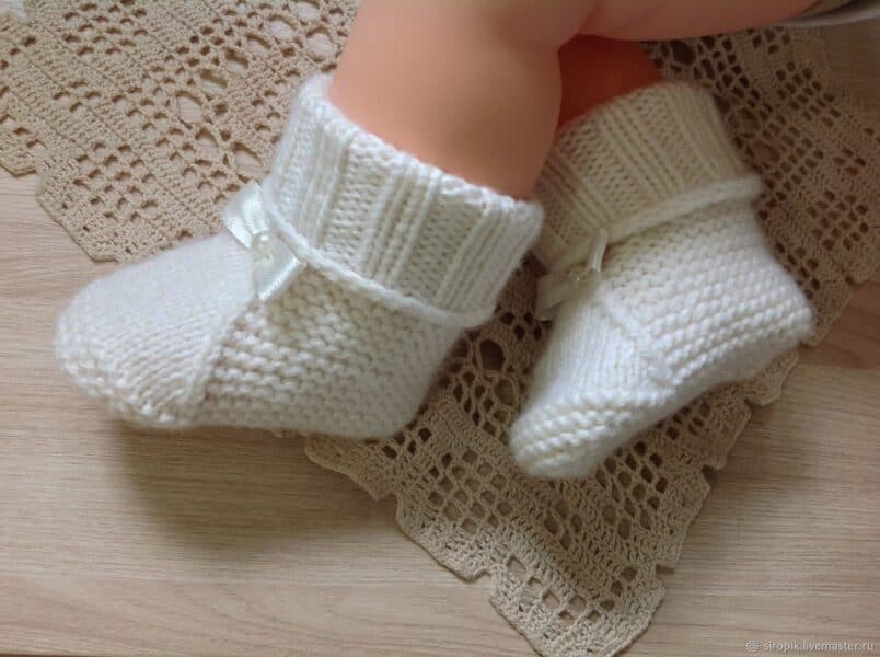 Для малыша в возрасте до полугода следует набрать на спицы 32 петли. Затем распределить равномерно на четыре спицы, по 8 петель на каждую. Сначала вяжется резинка — 2 лицевых, две изнаночных до 24 ряда. Далее с каждой спицы нужно убавить по одной петле. Для формирования пятки нужно будет объединить петли с двух спиц и вязать лицевой гладью восемь рядов. Затем 10 петель провязать лицевыми, убавив на 1 петлю, провязав две вместе. Перевернув вязание, провязать 6 петель изнаночными и также сделать убавление. Провязывается и делается убавление до тех пор, пока не спице не останется шесть петель.
