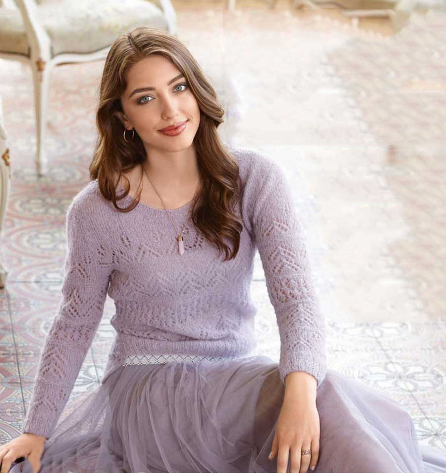 Применяется два вида пряжи: Angora Gold Star (5% пайетки, 8% мохер, 9% шерсть, 11% полиэстер, 67% акрил) и Rock-n-Roll (9% мериносовая шерсть, 21% акрил, 70% полиамид). Вяжется пуловер на обычных круговых спицах № 3 и № 3,5.