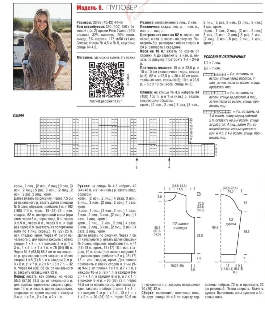 Возьмите пряжу 40% альпака, 32% вискозы, 20% полиамида и 8% шерсти — Peru Tweed. В описании указаны размеры 36/38 (40/42) 44/46